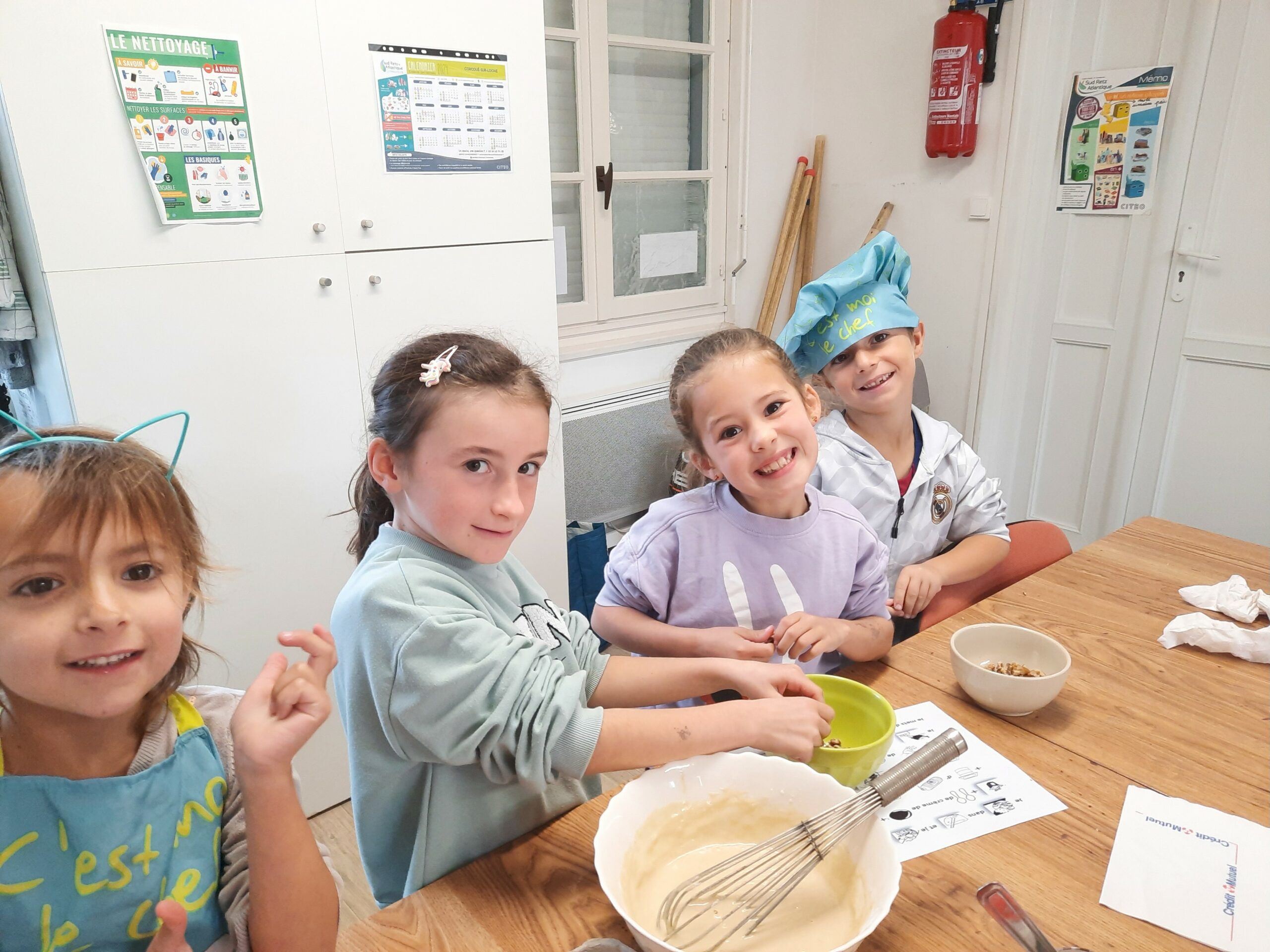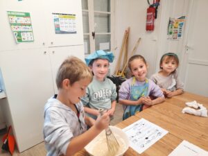 Le mardi 14 octobre, nous avons cuisiné pour faire un gâteau au yaourt aux noix et aux marrons. Les cuisiniers ont pu mettre un tablier et une toque de chef.