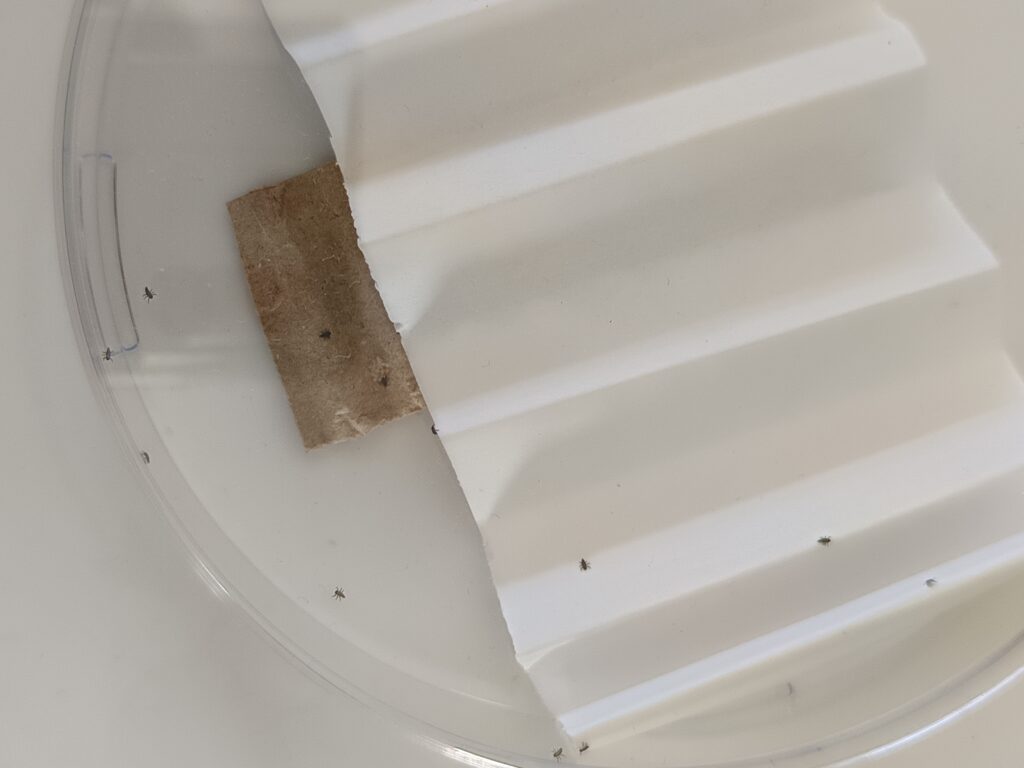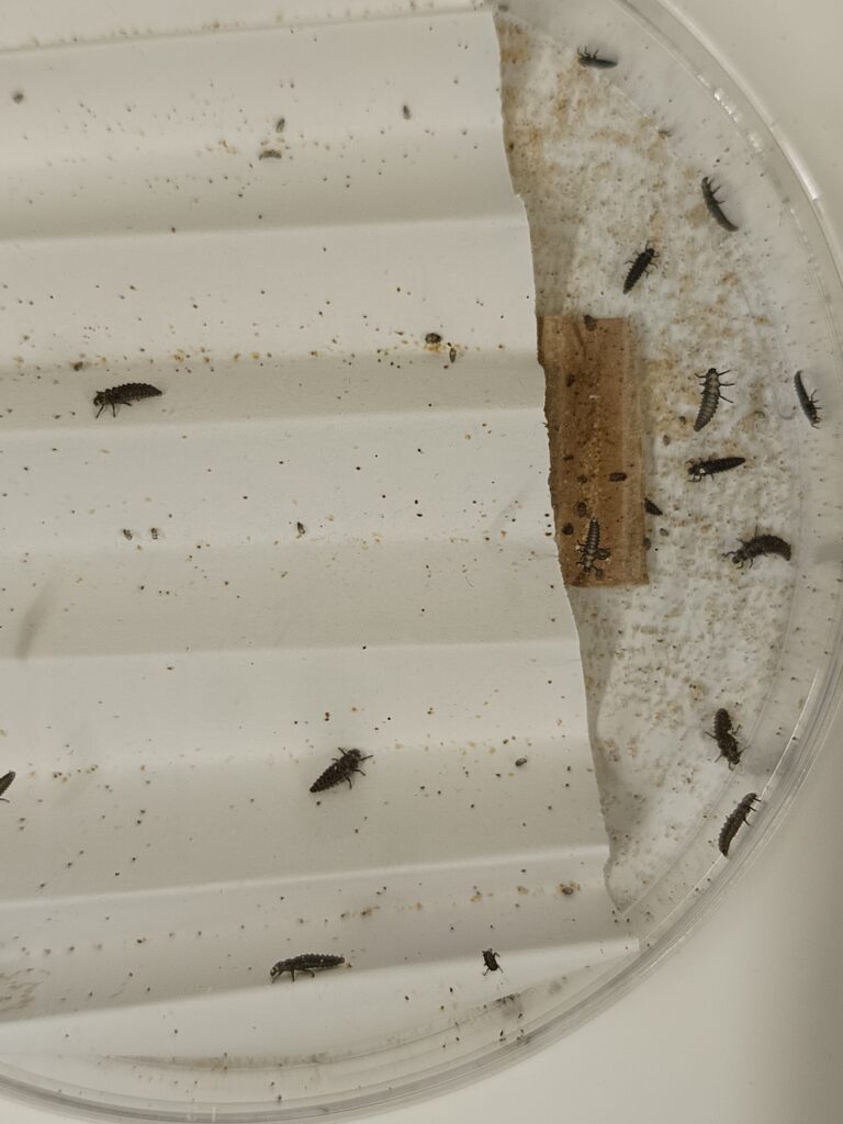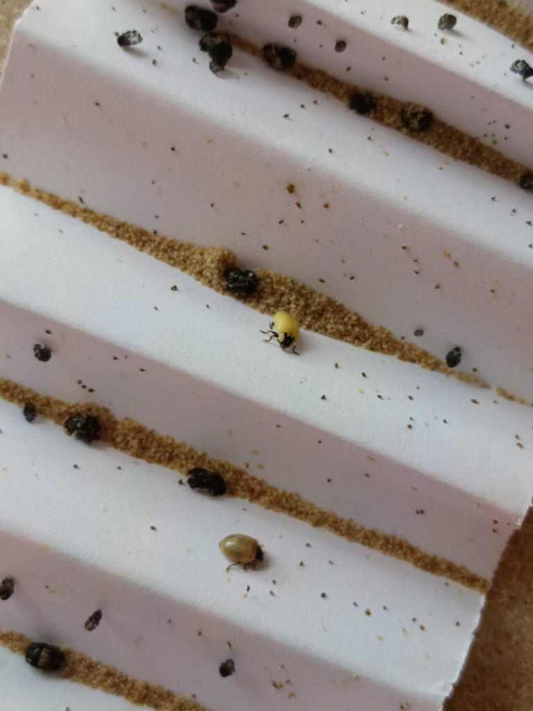 Les petites bêtes de notre élevage grossissent. Après les 4 stades larvaires, nos insectes abordent le stade de nymphose.